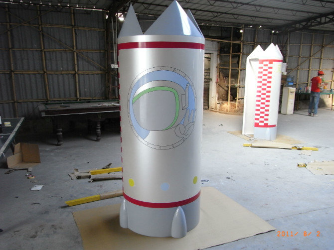 玻璃鋼造型 模型火箭,根據(jù)客戶的設(shè)計圖紙,采用玻璃鋼手糊成型工藝加工制作,表面噴涂汽車保護(hù)漆。